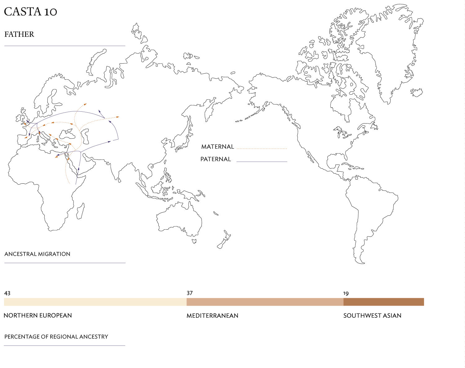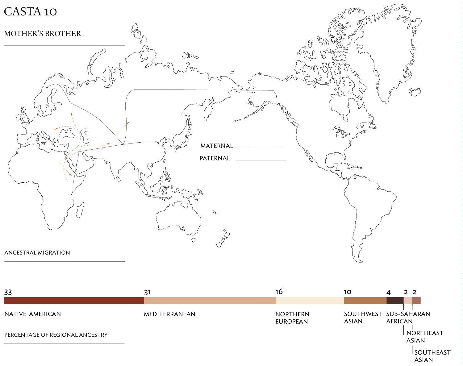 This modern extended family Casta portrait foregrounds the mother’s daughter-in-law and baby granddaughter and ends with her second husband. The Mother’s brother (not depicted) and second husband (far right) was DNA tested.
